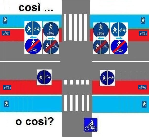 Per non realizzare i quadrotti sono stati installati ben 4 cartelli che, pochi metri prima di ogni intersezione, "trasformano" la pista ciclabile (separata) in percorso promiscuo ciclopedonale. Ed in tal caso, secondo un parere ministeriale, i ciclisti potrebbero (il condizionale è d'obbligo) utilizzare le strisce pedonali, in sella, senza scendere.