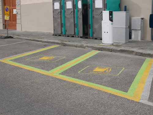 Come promesso dal precedente assessore, sono stati ridisegnati gli stalli di ricarica per le auto elettriche. Come si sa, le righe dei parcheggi riservati sono gialle, così, visto che le righe degli stalli per la sosta dei residenti stanno diventando gialle, per evidenziare maggiormente la differenza degli stalli di ricarica è stata fatta una cornicina verde. Devo dire che sì, sono evidenti, ma evidentemente non abbastanza, visto che mi capita di continuare a vederci parcheggiate auto senza la s ...