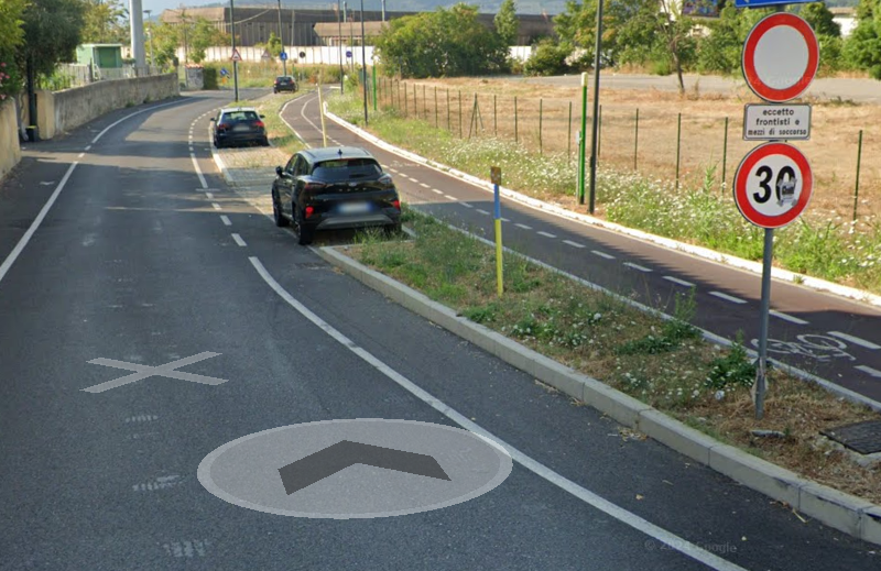 Via delle 2 Case Alla fine della ciclabile bidirezionale, a quei pochi frontisti e mezzi di soccorso che dovrebbero passare di lì è segnalato che troveranno ciclisti in strada. Quella protetta dal cordolo, invece, è una pista ciclabile a senso unico, per chi da Sesto viene verso Firenze. Questo è evidente dalla segnaletica orizzontale.