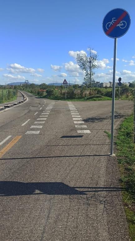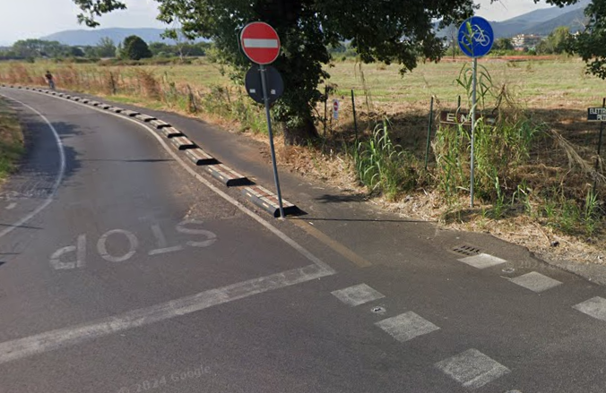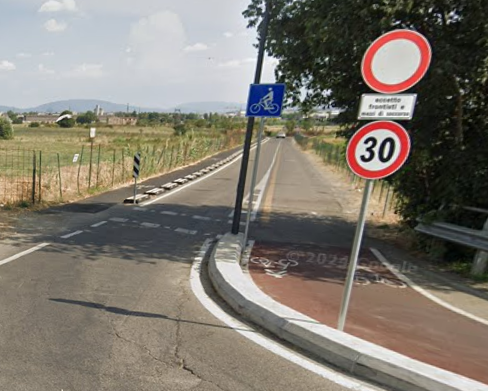 Passato l’aeroporto e l’incrocio con via dei Cipressi, il ciclista che va verso Firenze è invece obbligato ad andare in strada (v. cartello di fine pista e attraversamento ciclabile), da condividere in teoria con i pochi frontisti e mezzi di soccorso, che hanno il limite a 30 Km/h.