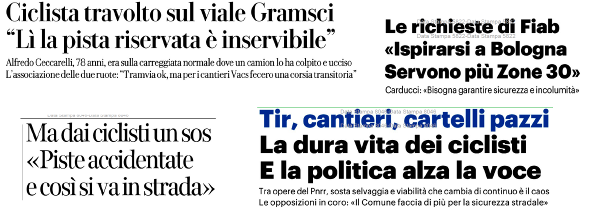 Nel ribadire la nostra disponibilità e nell’offrire le nostre competenze per intervenire sulle situazioni di criticità della mobilità urbana e ciclabile, e sperando in un reciproco rapporto di collaborazione, riportiamo di seguito alcune nostri comunicati rilevanti in merito ai recenti avvenimenti: sulla gestione del cantiere tram qui (Lavagnini lato Fortezza), qui (viale Matteotti, ultimo tratto VACS) e qui (Ponte Rosso). Su altri cantieri qui. In merito alla configurazione futura dei viali si legga qui; per quanto riguarda gli angoli ciechi per i mezzi pesanti qui.
