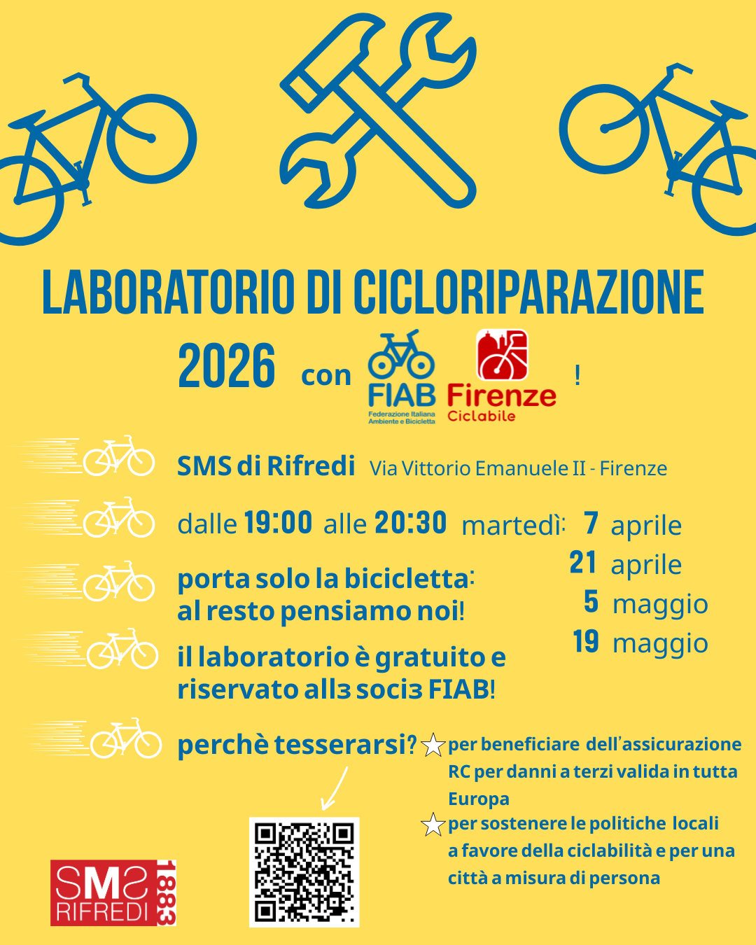 Sta per iniziare il laboratorio di cicloriparazione 2026, gratuito e riservato alle socie e ai soci di FIAB Firenze Ciclabile. A guidarci sarà Capomeccanico Michele della leggendaria Cicloteca di Via Lulli: ogni incontro sarà dedicato a un aspetto diverso della manutenzione, pratico e accessibile a chiunque.Non serve partecipare a tutti gli appuntamenti: vieni quando vuoi!Spazio esterno dell'SMS di Rifredi (a nostra disposizione anche il bar del Circolo!)Martedì 7 e 21 aprile, 5 e 19 maggio - dalle 19:00 alle 20:30Iscrizioni compilando il Google form.Per partecipare è necessaria la tessera FIAB Firenze Ciclabile: puoi associarti direttamente al Circolo oppure a questo link.A presto!